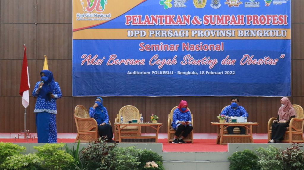 Setelah acara pelantikan dan angkat sumpah dilanjutkan kegiatan seminar nasional dengan tema Aksi Bersama Cegah stunting dan Obesitas dengan pembicara antara lain Ketua DPP PERSAGI Indonesia Kombes (Pol). Rudatin, SSt.MK, SKM, M.Si, Dosen UPN Veteran Jakarta yaitu Taufik Maryusman, S.Gz, M.Pd, M.Gizi., Ketua DPD PERSAGI Provinsi Bengkulu yaitu Emy Yuliantini, SKM, MPH., Dosen Politeknik Kesehatan Kementerian Kesehatan Bengkulu yaitu Ns. Yossi Utario, S.Kep, M.Kep, Sp.Kep.An
