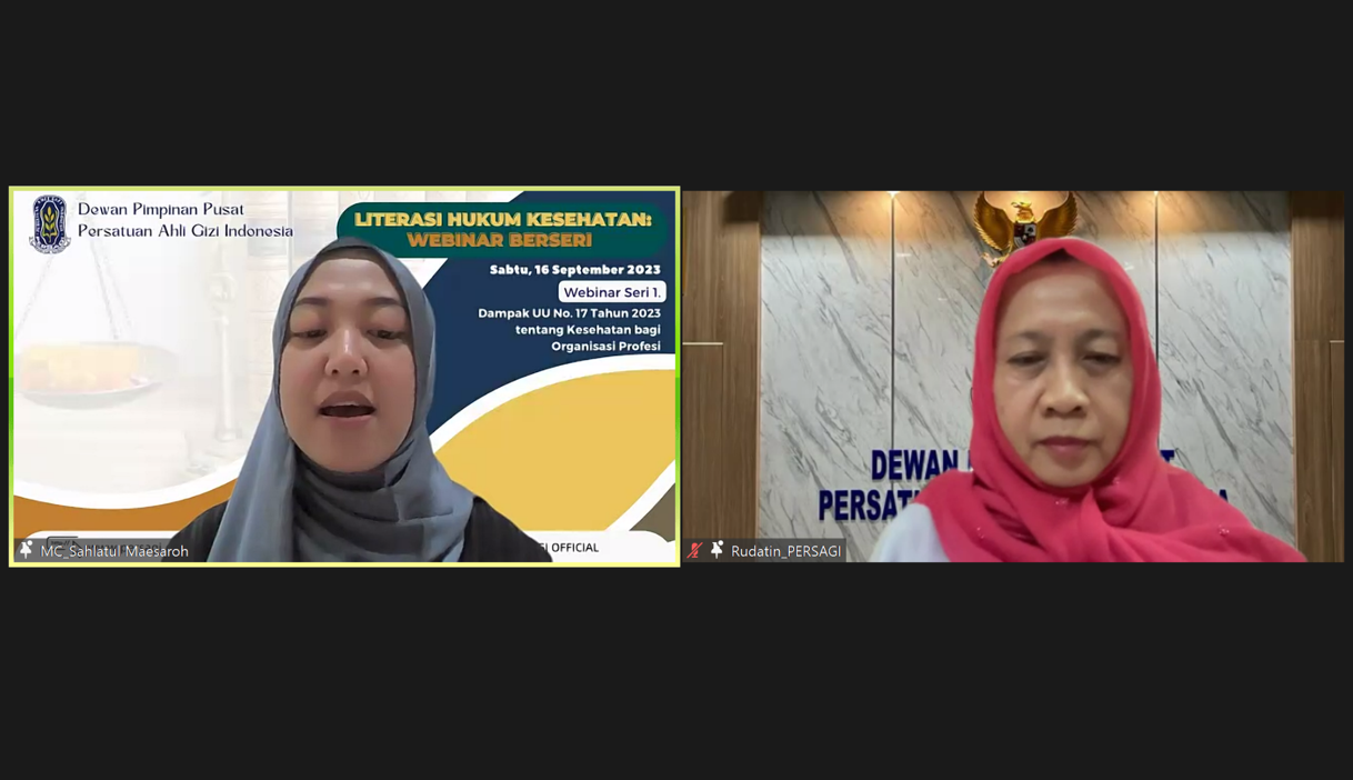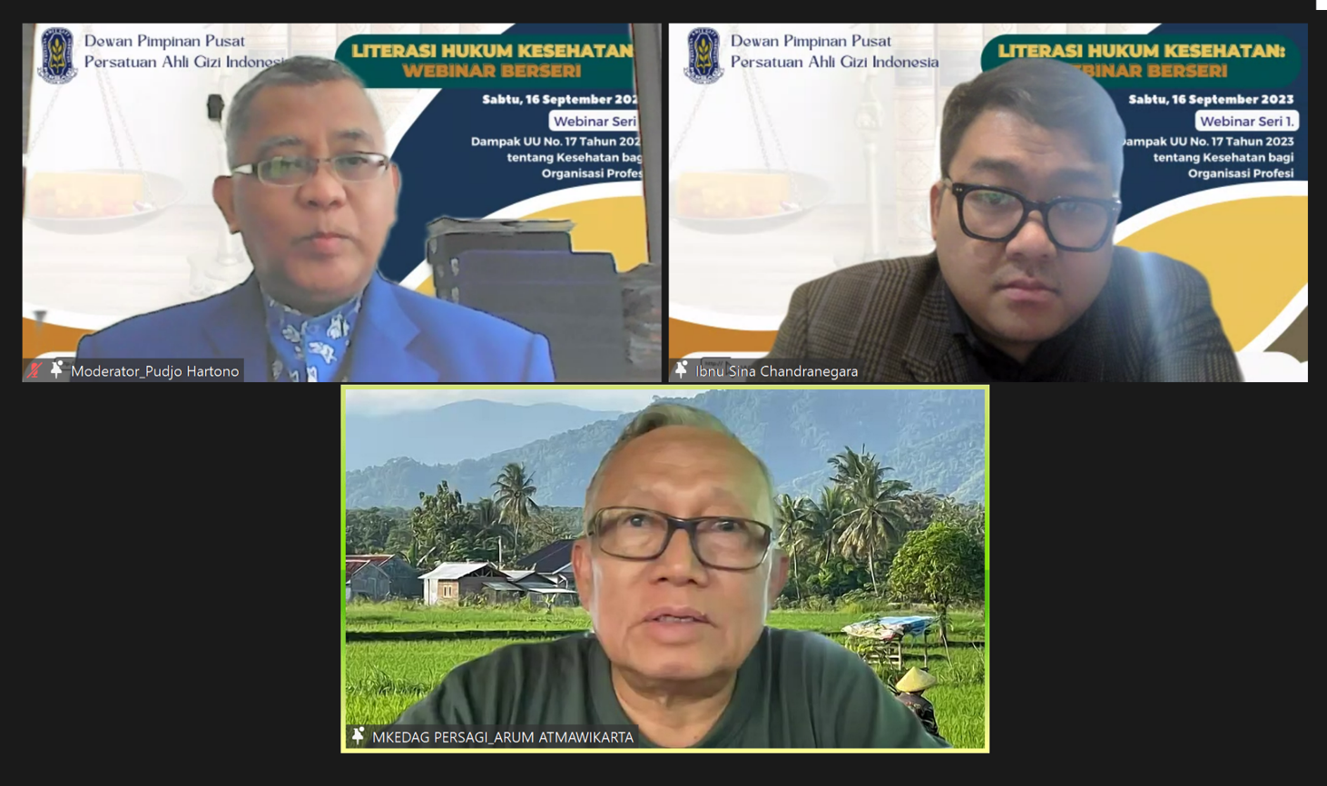 Dengan hadirnya Undang-Undang terbaru dengan nomor 17 tahun 2023 tentang Kesehatan yang mana mencabut 11 Undang-Undang yang ada sebelumnya, salah satunya UU no. 36 tahun 2014 tentang Tenaga Kesehatan. Menciptakan kepanikan dan hiruk pikuk di kalangan tenaga Gizi. Oleh karenanya menggagagas Bidang Hukum Dewan Pimpinan Pusat Persatuan Ahli Gizi Indonesia (DPP PERSAGI) bersama dengan Majelis Kehormatan Etik, dan Disiplin Ahli Gizi (MKEDAG) menyelenggarakan Webinar Berseri Literasi Hukum Kesehatan bagi para Tenaga Gizi, Mahasiswa Gizi, dan Umum yang terbagi menjadi 5 (lima) seri.