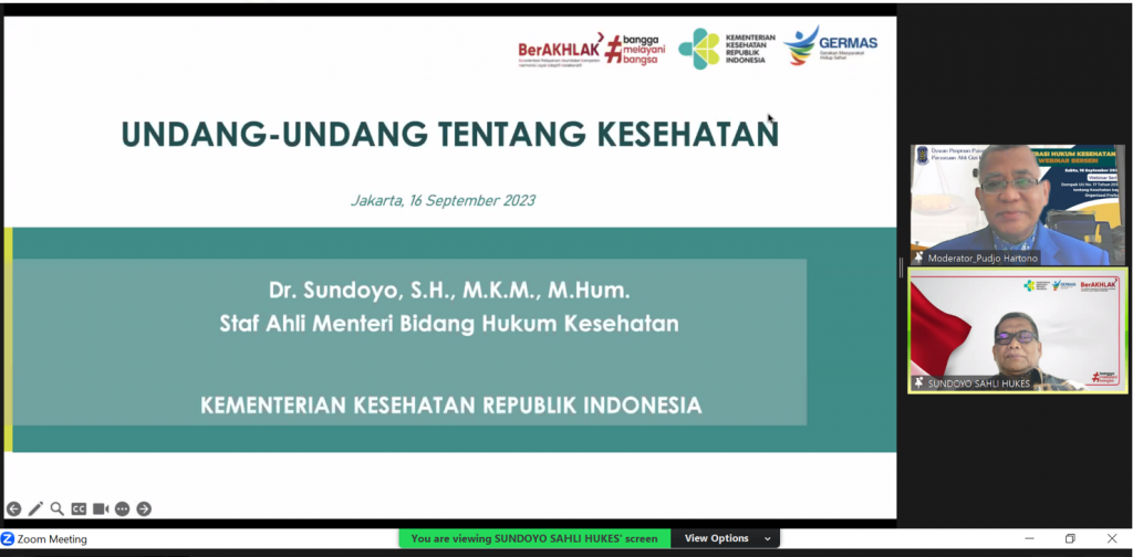 Sabtu pagi hari (16/09/2023) diawalilah seri ke-1 Webinar Literasi Hukum Kesehatan yang menghadirkan Narasumber dan Pembahas dengan bahasan topik “Dampak UU No. 17 Tahun 2023 tentang Kesehatan bagi Organisasi Profesi”. Webinar ini dibuka oleh Bu Ketua Umum, Bu Rudatin, SSt.MK, SKM, M.Si dengan penjelasan terkait latar belakang harus diadakannya webinar berseri ini. Salah satunya adalah untuk tujuan ahli gizi yang ‘melek hukum’. Bu Ketua Umum pun berpesan agar materi yang didapat ini dapat ditindaklanjuti untuk kelangsungan eksistensi Organisasi Profesi PERSAGI ke depannya.