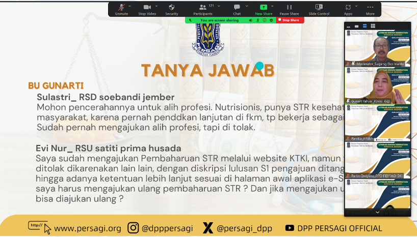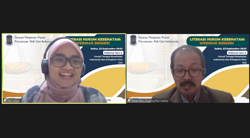 Webinar Berseri Literasi Hukum Kesehatan yang diadakan Dewan Pimpinan Pusat Persatuan Ahli Gizi Indonesia (DPP PERSAGI) memasuki seri kedua yang diadakan pada hari Sabtu (23/09/2023) bersama dengan dua narasumber dari instansinya masing-masing. UU nomor 17 tahun 2023 tentang Kesehatan menyebutkan nomenklatur terkait Konsil yang di dalamnya ada Konsil Gizi. Serta Kolegium yang pada UU tersebut disebutkan sebagai kumpulan ahli dari setiap disiplin ilmu kesehatan yang mengampu cabang disiplin ilmu tersebut. Kolegium Ilmu Gizi Indonesia (KIGI) yang menjadi bagian dari PERSAGI tidak terlepas dari amanat yang disampaikan Undang-undang sebagai apa yang disebut sebagai Kolegium.