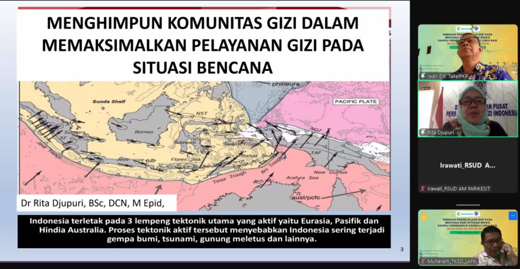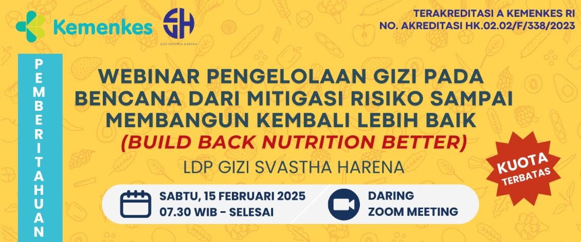 Dalam rangkaian Peringatan Hari Gizi Nasional tahun 2025 telah dilaksanakan “Webinar Pengelolaan Gizi Pada Bencana Dari Mitigasi Risiko Sampai Membangun Kembali Lebih Baik” yang diselenggarakan oleh LDP Gizi Svastha Harena melalui daring zoom meeting. Webinar ini berlangsung pada hari Sabtu tanggal 15 Februari 2025 dengan menghadirkan para nara sumber dari BNPB, Kementerian Sosial RI, Gabungan Pengusaha Makanan dan Minuman Indonesia (GAPPMI), UNICEF Indonesia, Kementerian Kesehatan RI, dan DPP Persatuan Ahli Gizi Indonesia (PERSAGI). Webinar ini dihadiri para petugas gizi yang sering terlibat dalam penanganan bencana, relawan bencana, dosen, petugas Puskesmas, mahasiswa, dokter, pejabat dan staf Dinas Kesehatan kabupaten dan kota, serta Lembaga Swadaya Masyarakat (LSM).
